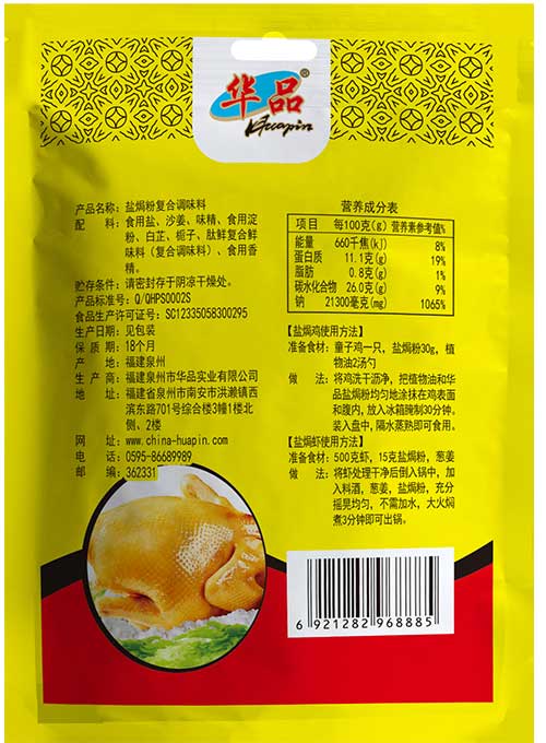 盐焗鸡使用方法 准备食材:童子鸡一只,盐焗粉30g,植物油2汤勺 做法:将鸡洗干沥净,把植物油和华品盐焗粉均匀地涂抹在鸡表面和腹内,放入冰箱腌制30分钟。装入盘中,隔水蒸熟即可食用。 盐焗虾使用方法 准备食材:500克虾,15克盐焗粉,葱姜 做法:将虾处理干净后倒入锅中,加入料酒,葱姜,盐焗粉,充分摇晃均匀,不需加水,大火焖煮3分钟即可出锅。