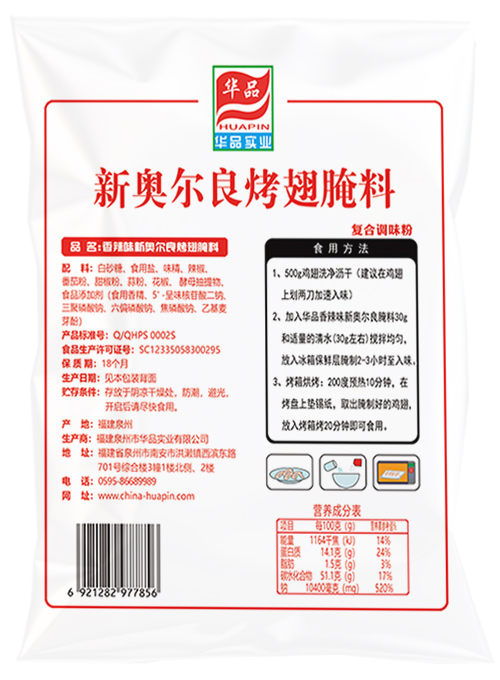 1、500g鸡翅洗净沥干(建议在鸡翅上划两刀加速入味) 2、加入华品香辣味新奥尔良腌料30g 和适量的清水(30g左右)搅拌均匀,放入冰箱保鲜层腌制2-3小时至入味。 3、烤箱烘烤:200度预热10分钟,在烤盘上垫锡纸,取出腌制好的鸡翅,放入烤箱烤20分钟即可食用。