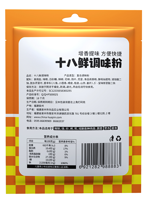 食用盐、味精、白砂糖、辣椒、花椒、蒜片、芫荽、食用香精、酵母抽提物、琥珀酸二钠、脱水芹菜叶、香辛料(八角、小茴香、橘皮、桂皮、山奈、姜片)、5‘-呈味核苷酸二钠