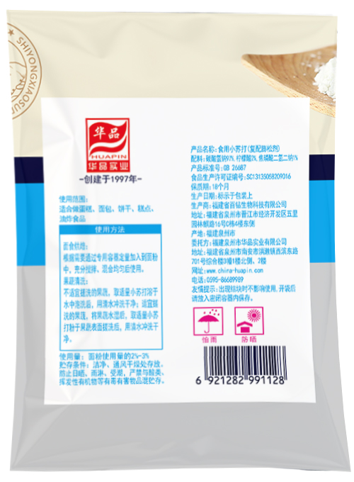 面食烘焙: 根据需要通过专用容器定量加入到面粉中,充分搅拌、混合均匀后使用。 果蔬清洗: 不适宜搓洗的果蔬,取适量小苏打溶于水中泡洗后,用清水冲洗干净;适宜搓洗的果蔬,将果蔬水湿后,取适量小苏打粉于果蔬表面搓洗后,用清水冲洗干净。
